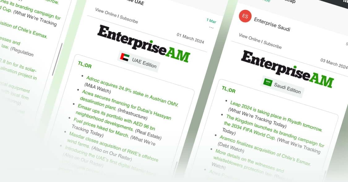 A daily dose of business, economics, and policy news from KSA, UAE, and Egypt, direct to your inbox every weekday at 7am. Dive deep into the region's Logistics industry and stay updated with comprehensive insights from the Climate sector, from Monday to Thursday.